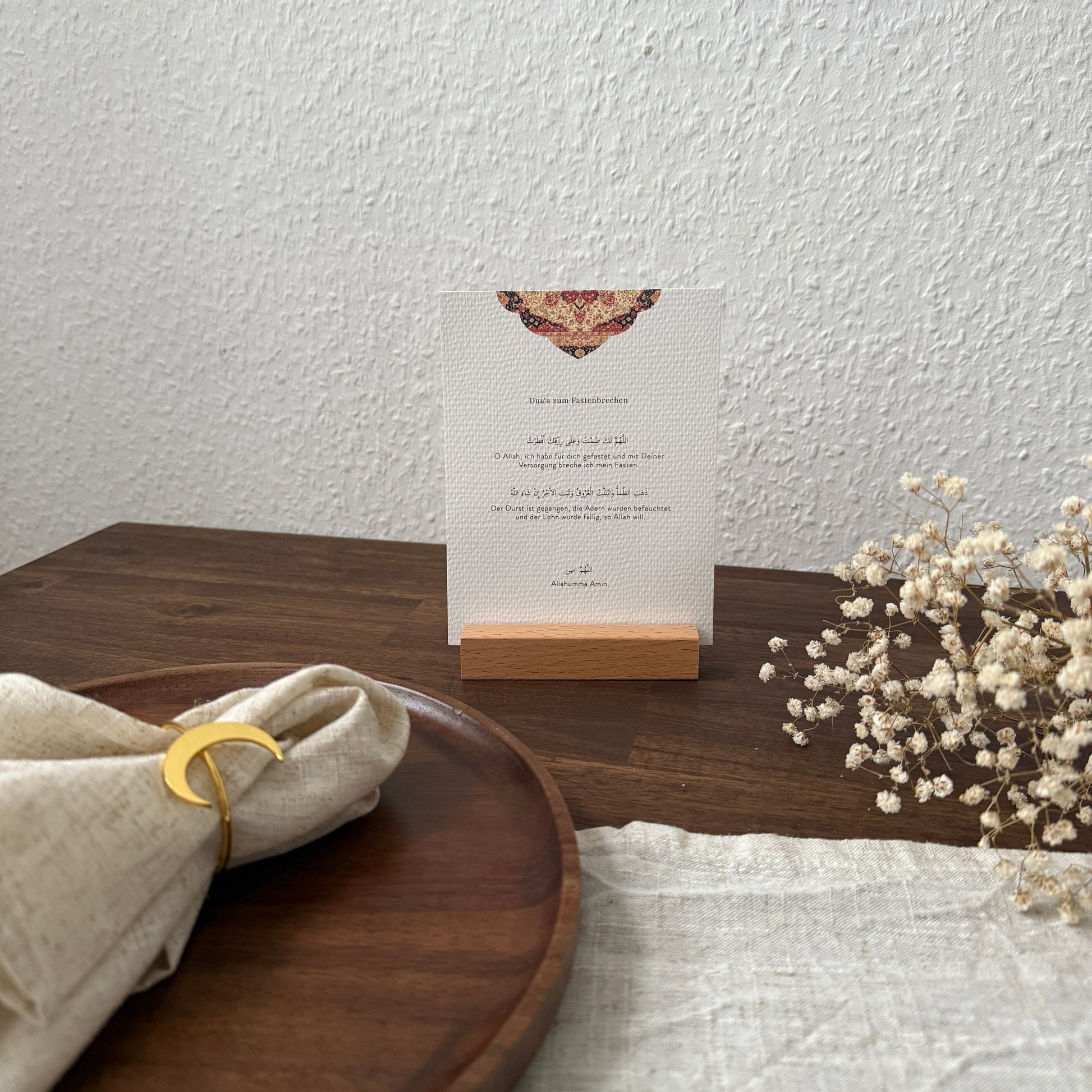 Schlichtes Kartendesign auf hochwertigem, strukurierten Papier. Dazu gibt es einen Holzaufsteller. Perfekt im Ramadan, um jeden an seine Dua'a vor dem Fastenbrechen zu erinnern in sha Allah.