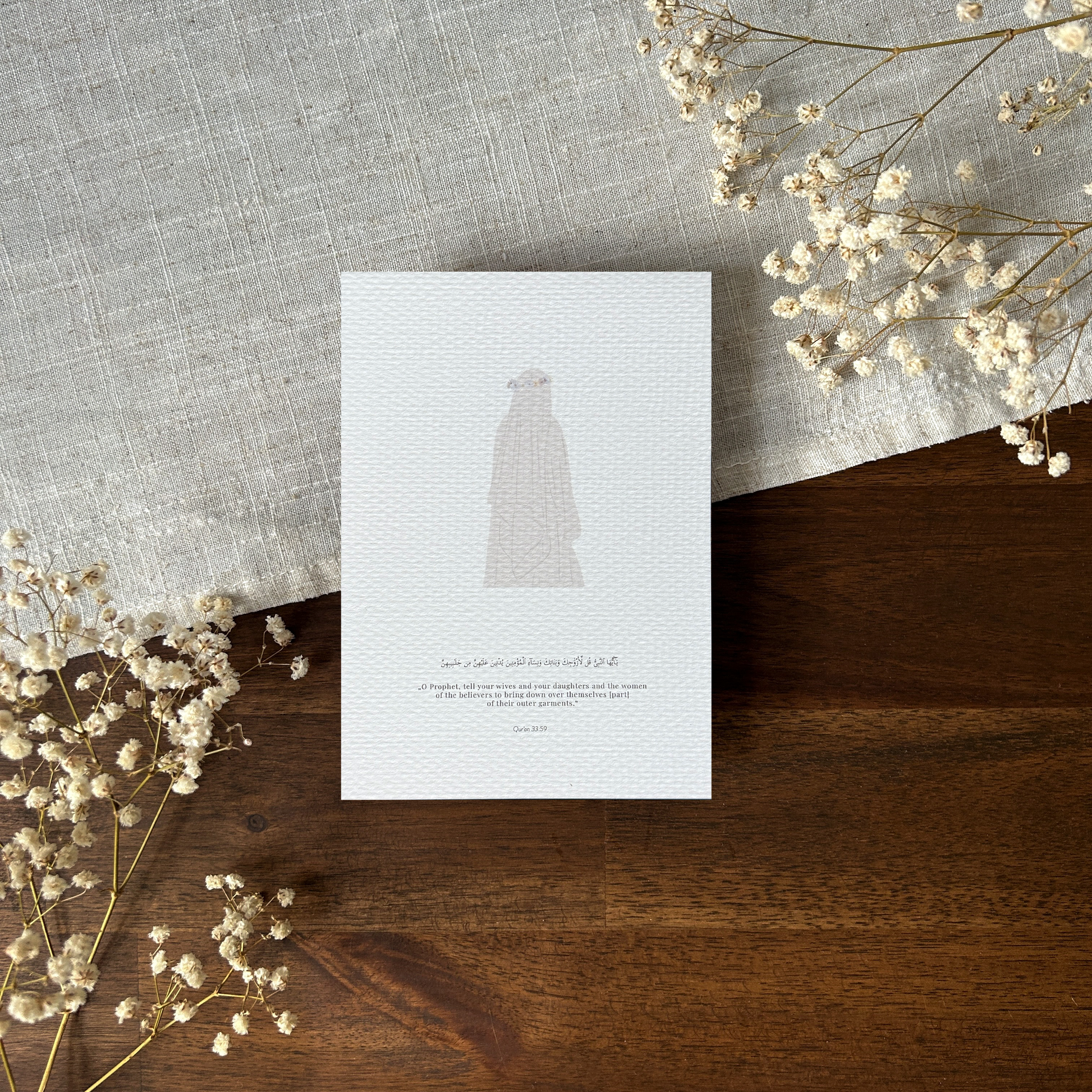 Eine besondere Karte für eine besondere Entscheidung: Diese A6-Karte mit hochwertigem 300mg Papier zeigt eine bedeckte Frau und einen inspirierenden Qur’an-Vers – ein Symbol für Stärke, Glaube und Neubeginn. Perfekt zum Verschenken an Schwestern, die ihren Weg mit dem Hijab begonnen haben – als liebevolle Geste der Ermutigung und Verbundenheit.