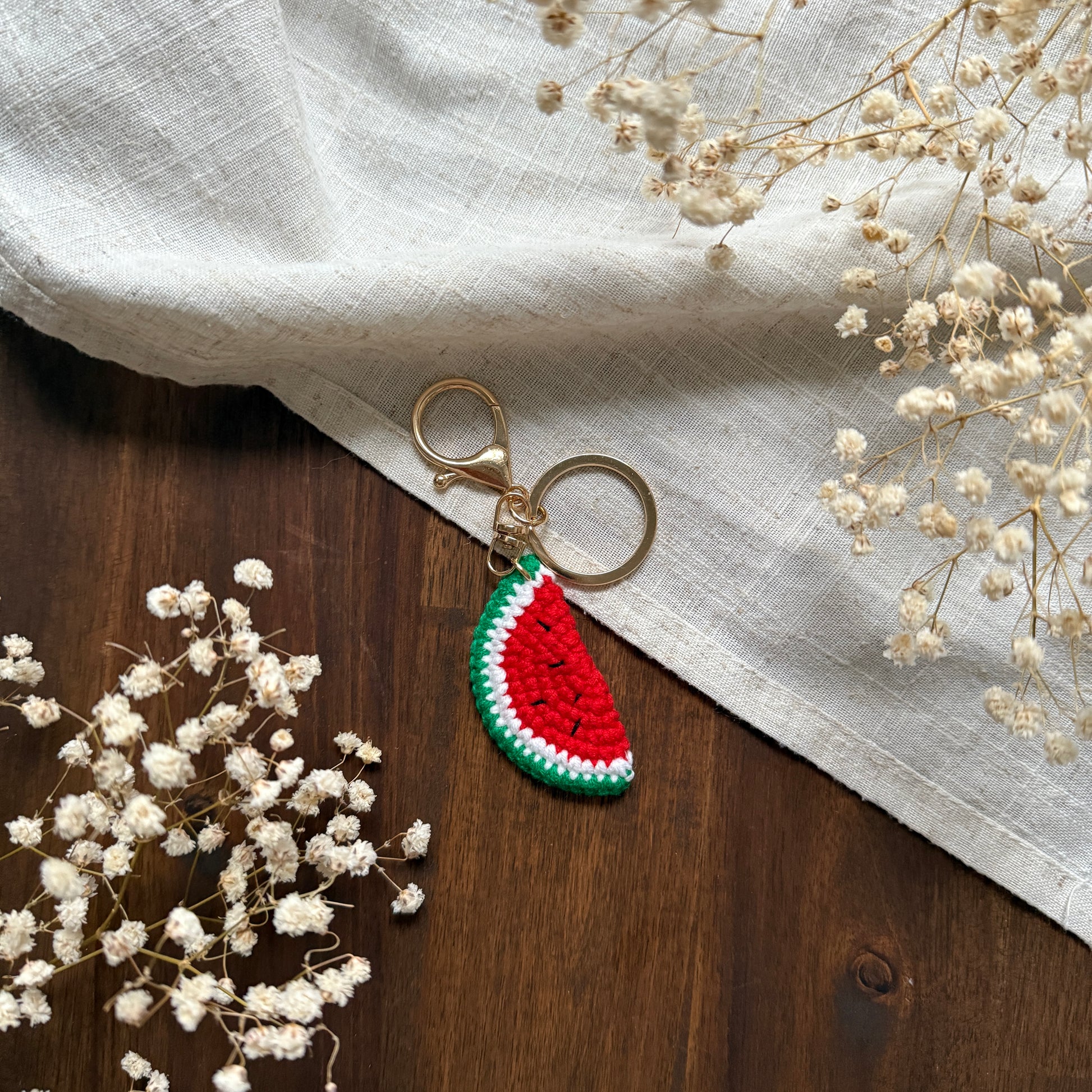 Wassermelonen Anhänger aus gehäkelter Baumwolle mit goldenem Haken.