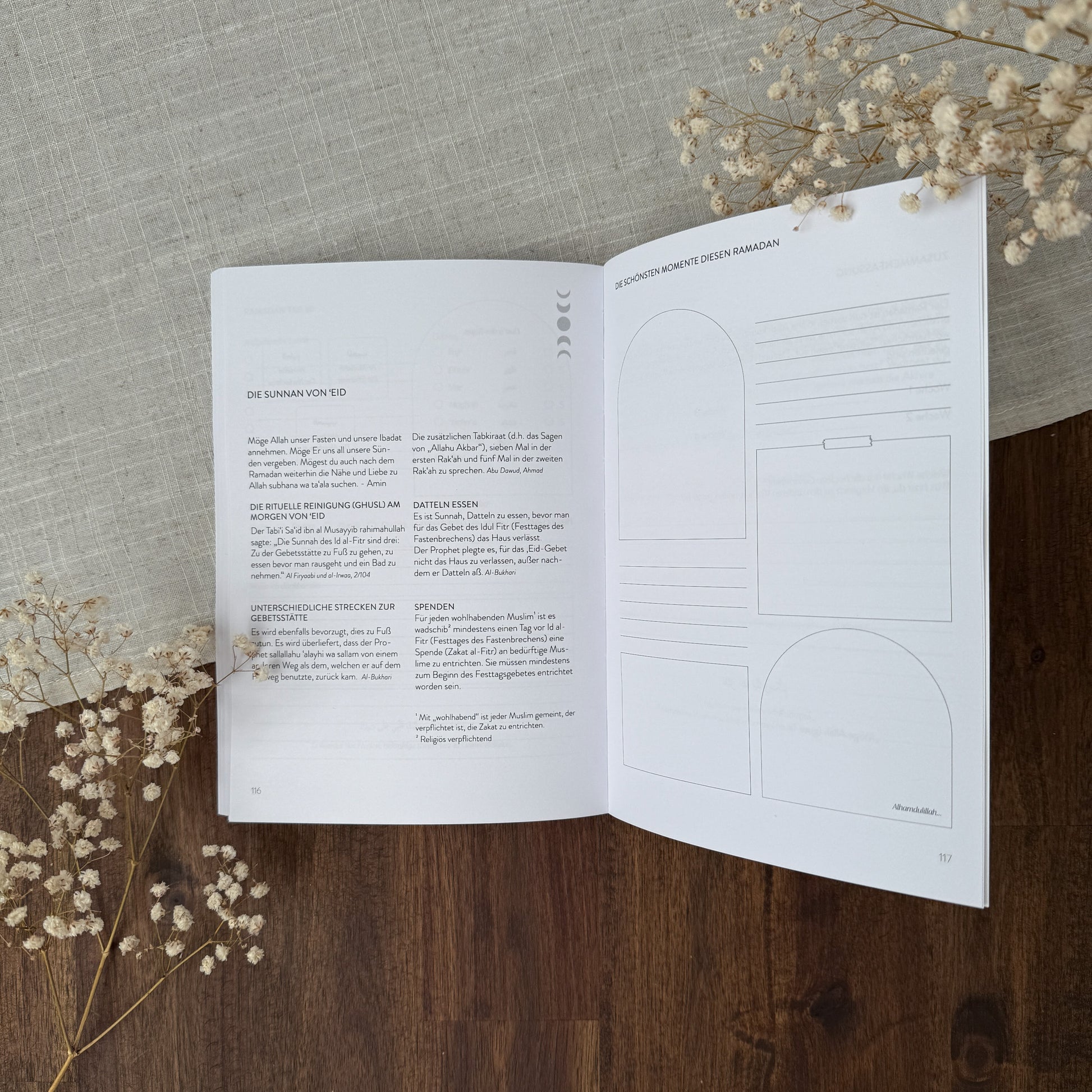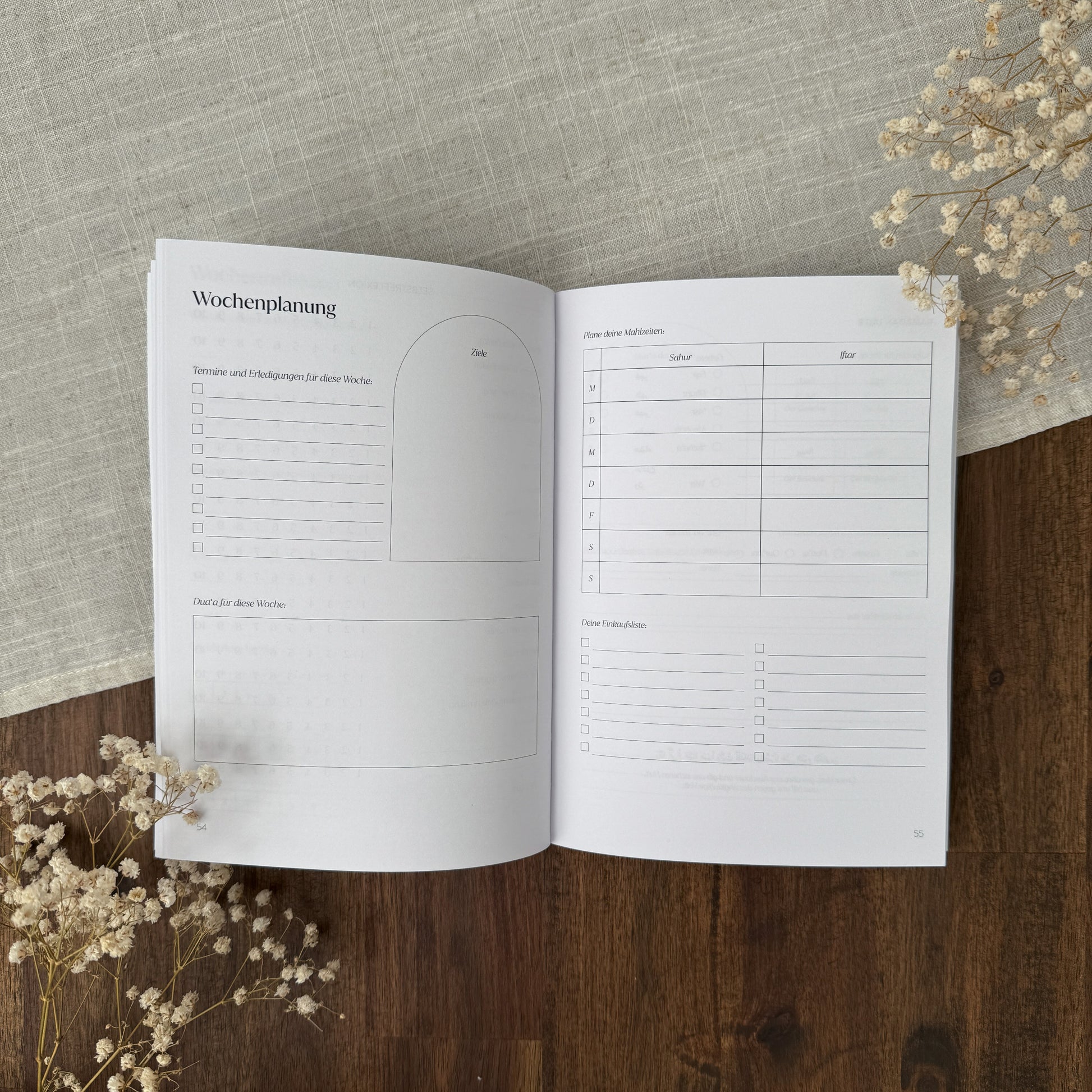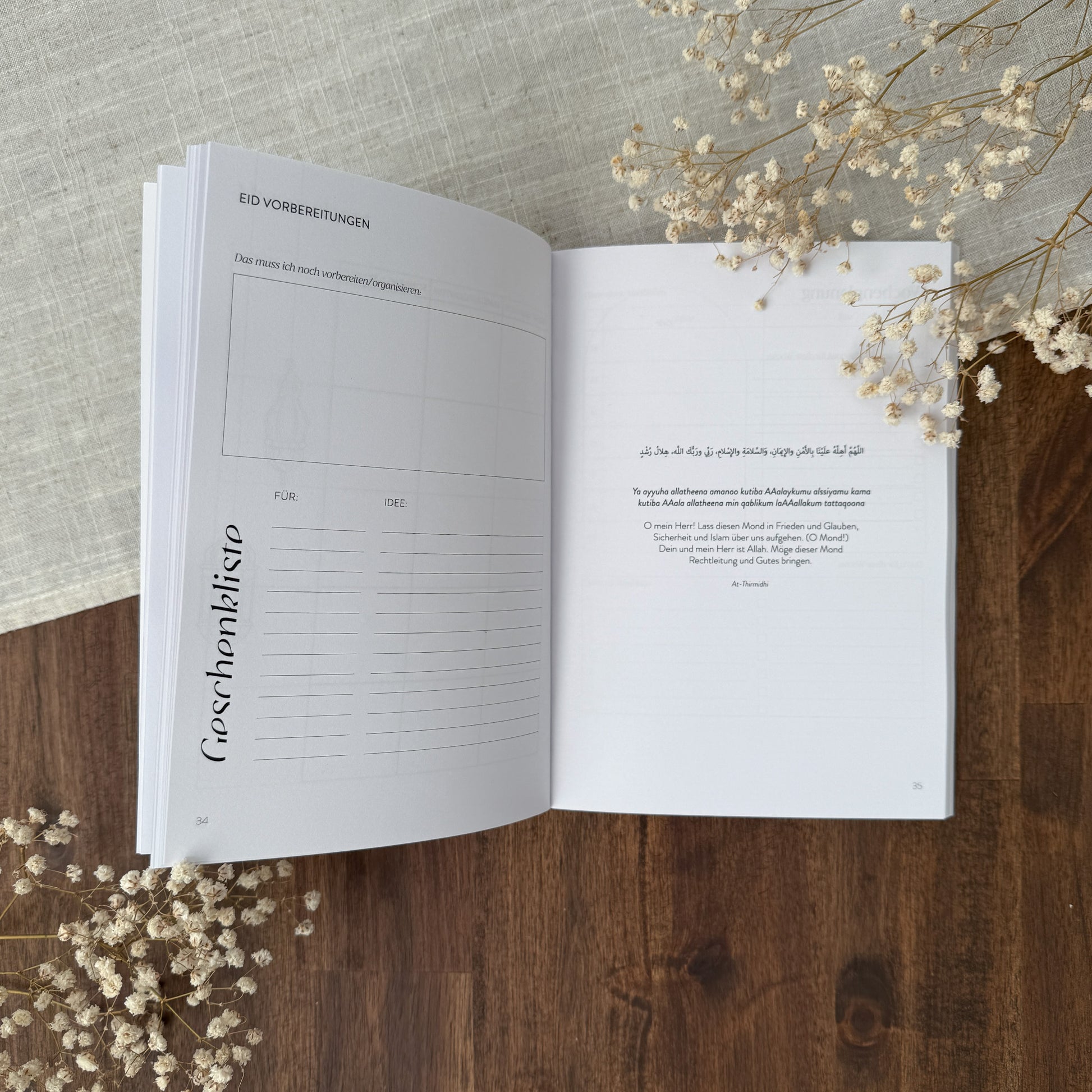 Unser Ramadan Planer unterstützt dich dabei, die heiligen Tage bewusst zu erleben und optimal zu nutzen in sha Allah. Er bietet Platz für deine täglichen Gebete, Gebetszeiten, persönliche Reflexionen und spirituelle Ziele. Mit seinen strukturierten Seiten hilft dir der Planer, deinen Fastenmonat zu organisieren, besondere Momente festzuhalten und deine Fortschritte zu dokumentieren.