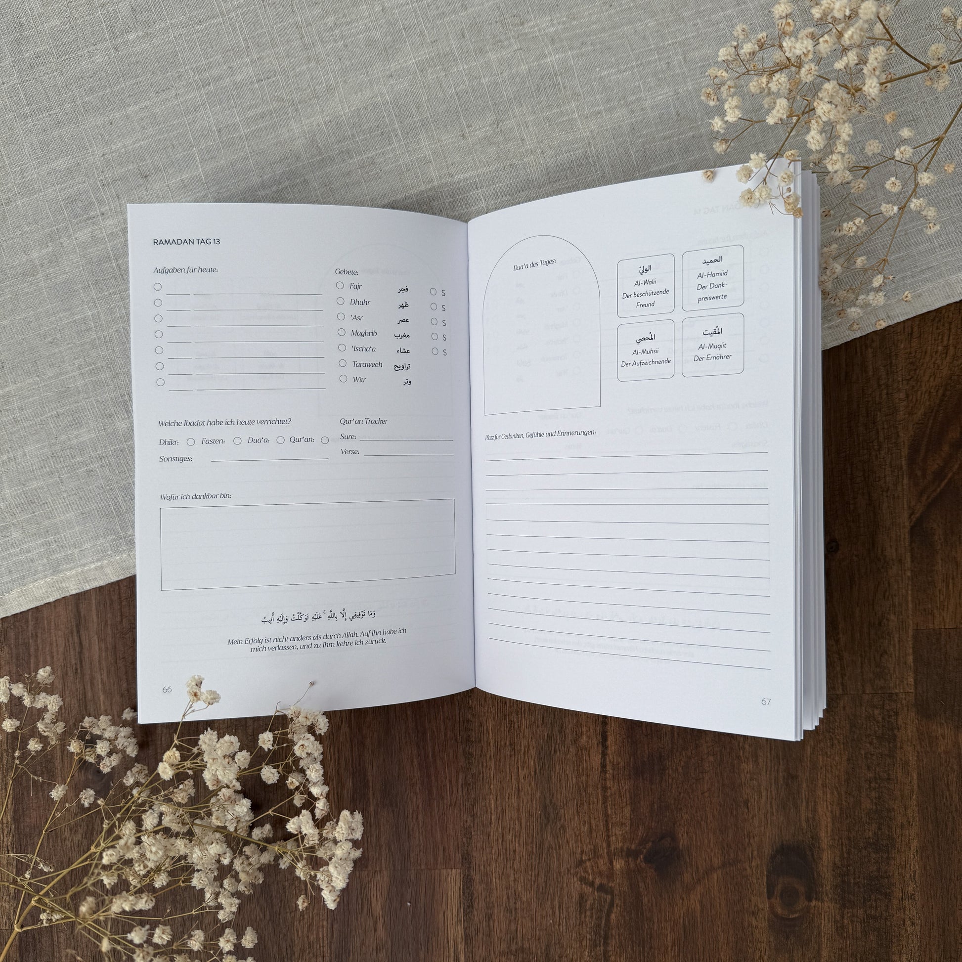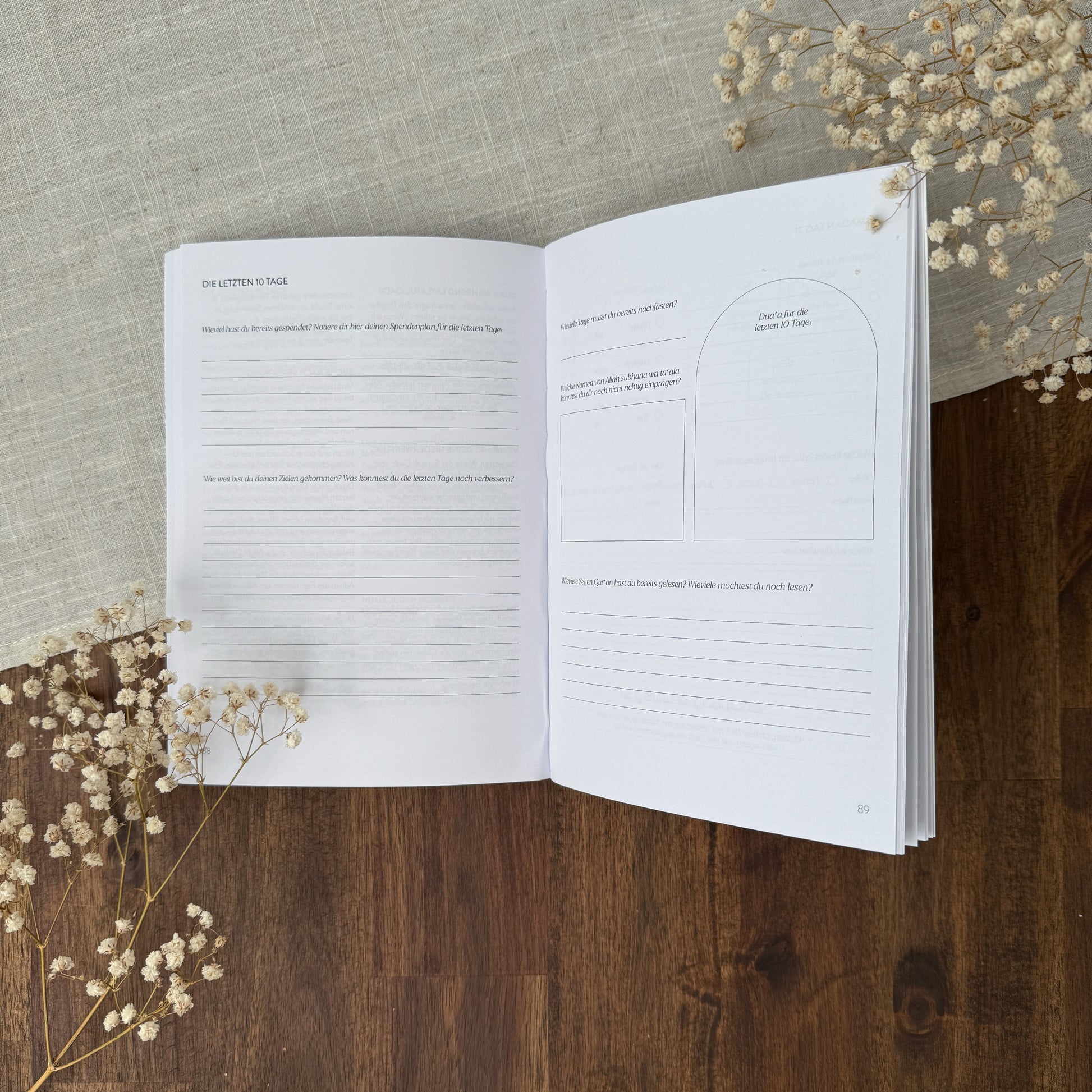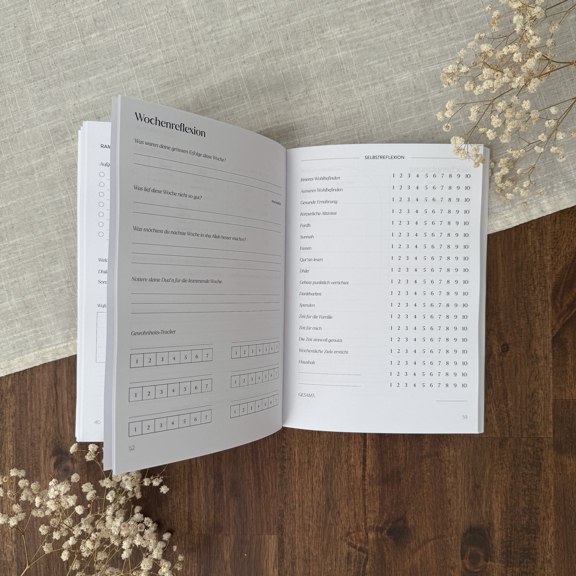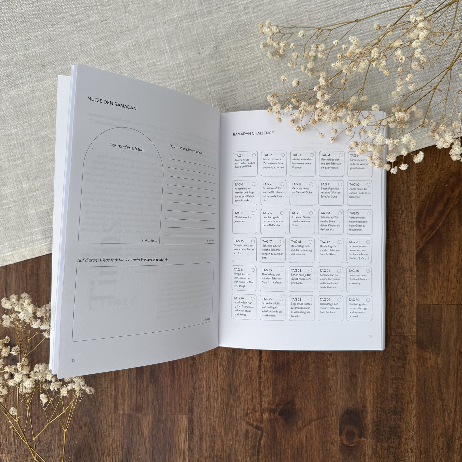 Unser Ramadan Planer unterstützt dich dabei, die heiligen Tage bewusst zu erleben und optimal zu nutzen in sha Allah. Er bietet Platz für deine täglichen Gebete, Gebetszeiten, persönliche Reflexionen und spirituelle Ziele. Mit seinen strukturierten Seiten hilft dir der Planer, deinen Fastenmonat zu organisieren, besondere Momente festzuhalten und deine Fortschritte zu dokumentieren.