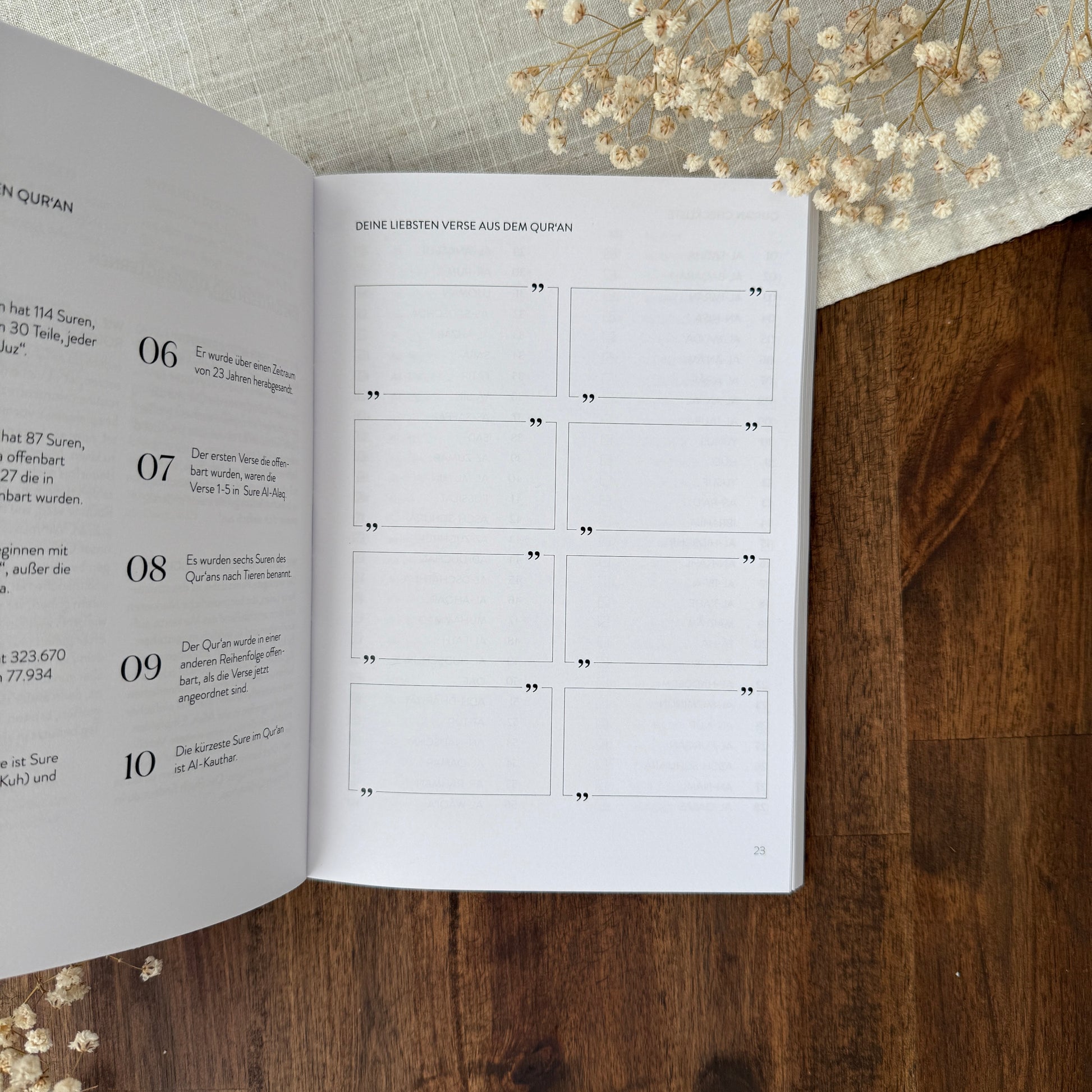 - Eine tägliche Seite: Gebete tracken, Aufgaben+Zeiten eintragen, Qur'an Tracker, eigene Dua’a des Tages, Wofür ich dankbar bin, Welche Ibadat habe ich heute verrichtet, jeden Tage eine andere Dua'a, Notizen & Gedanken, ein Paar Namen Allahs